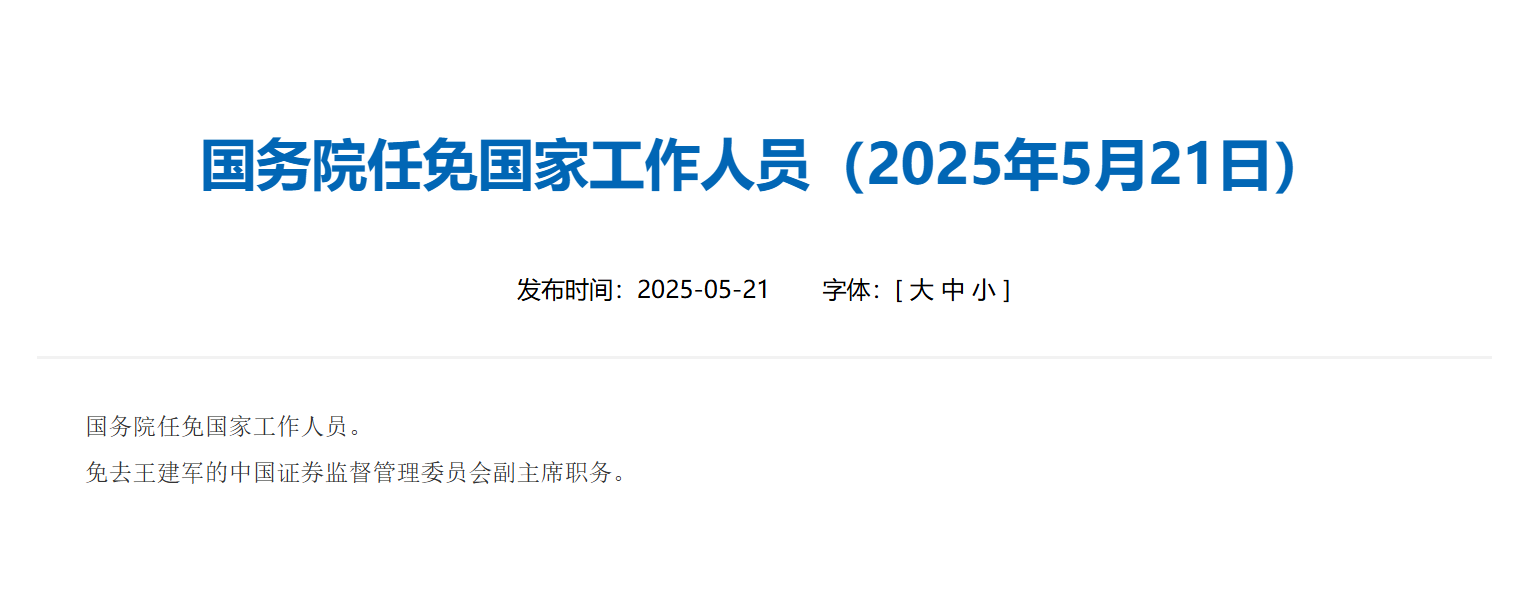 国务院任免国家工作人员,免去王建军的中国证券监督管理委员会副主席职务。