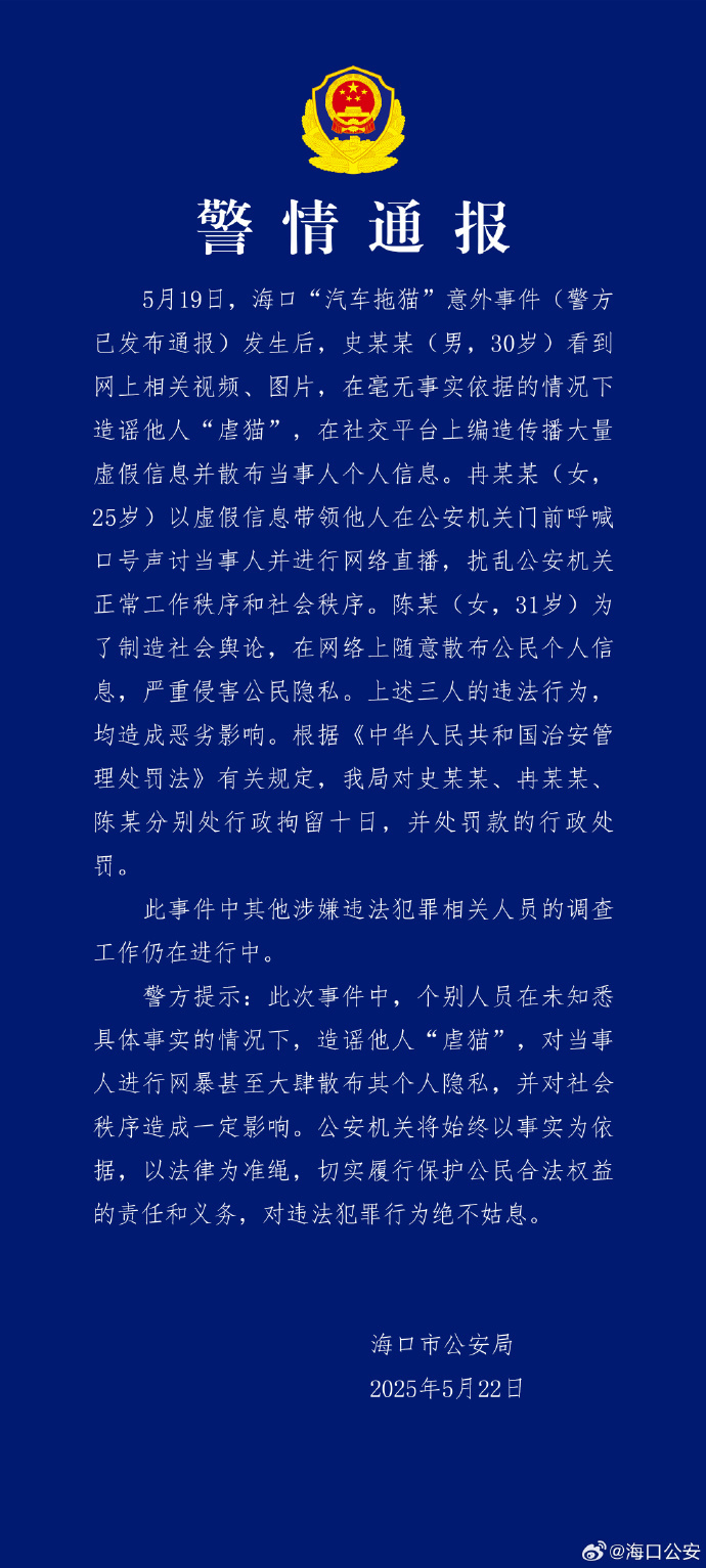 5月22日,@海口公安 ​​​再通报“汽车拖猫”意外事件,通报显示,三人造谣网暴他人被拘十日。