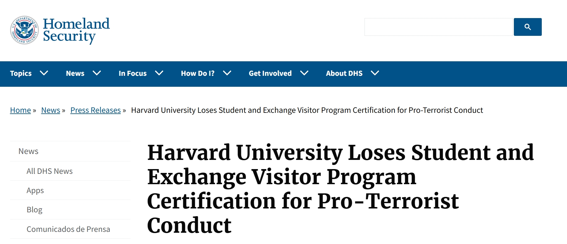 根据美国国土安全部官网声明,哈佛大学因为“支持恐怖主义行为”,被取消学生和交流访问者项目(SEVP)认证。声明表示,这意味着哈佛大学将无法再招收国际学生,同时现有国际学生必须转学,否则将失去合法身份。