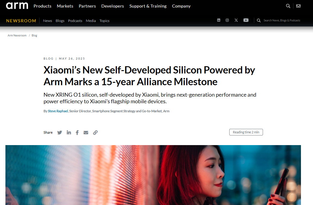 Arm祝贺小米玄戒O1芯片问世。5月26日消息,Arm官网今日通过新闻稿为小米玄戒O1芯片问世发来“贺电”,题为“Arm 赋能的小米全新芯片问世,标志着双方15年合作的重要里程碑(Xiaomi's New Self-Developed Silicon Powered by Arm Marks a 15-year Alliance Milestone)”。