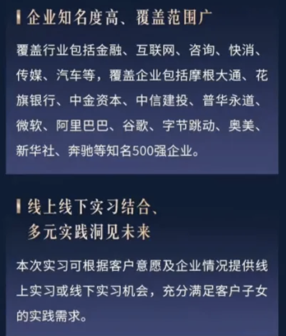 其中一位私行中心工作人员表示,这是总行开展的活动,亮点就是提供多家知名企业的线上线下实习机会,会提供实习证明,助力客户子女留学求职。该活动有40个名额,需要报名参加。