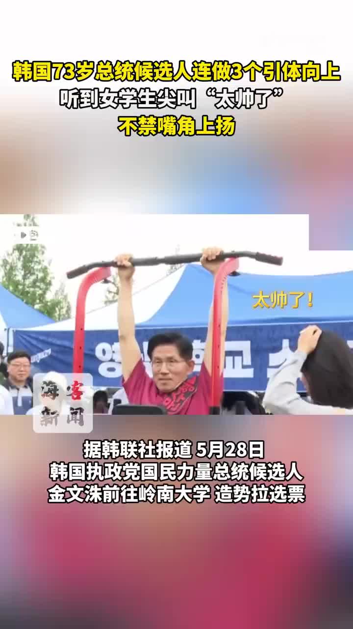 韩国73岁总统候选人连做3个引体向上,听到女学生尖叫“太帅了”,不禁嘴角上扬。据韩联社报道,5月28日,韩国执政党国民力量总统候选人金文洙前往岭南大学,造势拉选票。他冒雨连做3个引体向上,直到被身边人叫停。围观的大学生不断鼓掌,有女生尖叫“太帅了”。韩国大选投票6月3日举行。28日最新民调显示,在所有总统候选人中,李在明以49.2%的支持率领跑,金文洙以36.8%排名第二。(via 海客新闻)