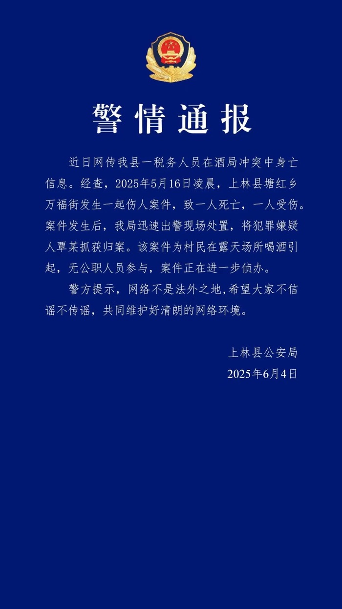 网传广西一税务人员在酒局冲突中身亡?警方通报:为村民在露天场所喝酒引起,无公职人员参与。广西上林县公安局6月4日发布警情通报:近日网传我县一税务人员在酒局冲突中身亡信息。经查,2025年5月16日凌晨,上林县塘红乡万福街发生一起伤人案件,致一人死亡,一人受伤。案件发生后,我局迅速出警现场处置,将犯罪嫌疑人覃某抓获归案。该案件为村民在露天场所喝酒引起,无公职人员参与,案件正在进一步侦办。警方提示,网络不是法外之地,希望大家不信谣不传谣,共同维护好清朗的网络环境。