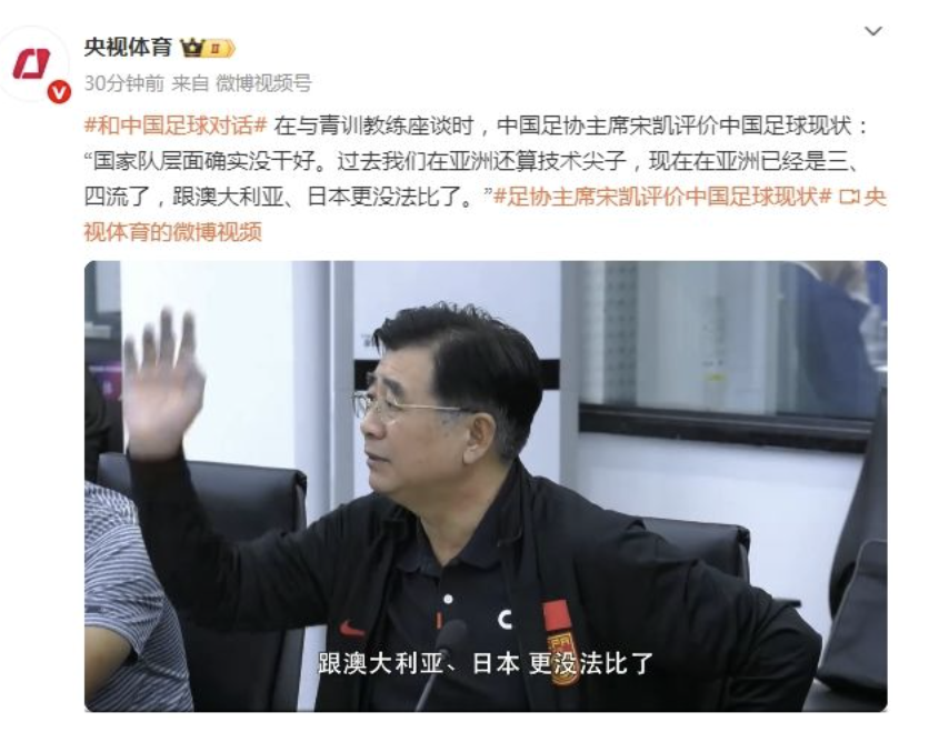 宋凯:中国足球,现在是亚洲三四流。据央视体育报道,世预赛18强赛首轮,中国队客场0-7不敌日本队,遭遇了一场大比分的失利。中日足球的差距不只是体现在7-0的比分上,而已渗透到关于足球的各个细节。在与青训教练座谈时,中国足协主席宋凯评价中国足球现状:“国家队层面确实没干好。过去我们在亚洲还算技术尖子,现在在亚洲已经是三、四流了,跟澳大利亚、日本更没法比了。”
