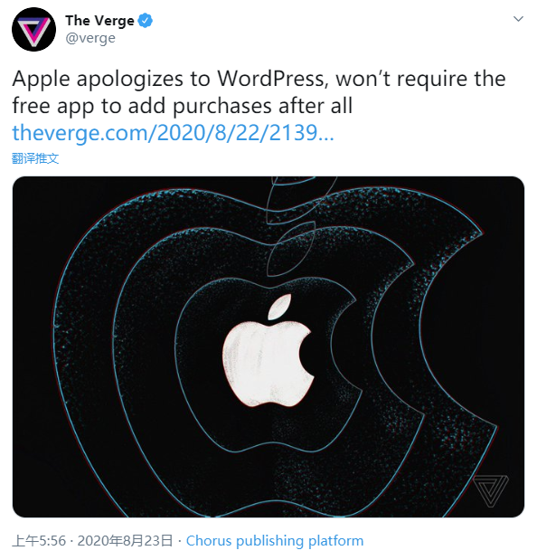 据The Verge报道,苹果公司发表了一份公开道歉声明,并表示WordPress将不再需要添加内购功能。苹果公开道歉声明称,我们相信WordPress应用的问题已经解决了。由于开发者从应用中删除了他们的服务支付选项的显示,现在它是一个免费的独立应用,不必提供应用内购买。我们已经通知了开发者,对于造成的任何困惑,我们深表歉意。