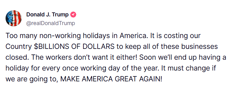特朗普抱怨美国假期太多:要伟大,少放假。美国总统特朗普在其社交平台上发文称,美国的非工作假日太多了。让企业强制歇业已导致美国损失数十亿美元。特朗普称,“工人们也不想这样!(照此趋势)很快我们每个工作日都可能变成假日。如果我们想让美国再次伟大,这种情况必须改变!”注:美国目前处于六月节假期。