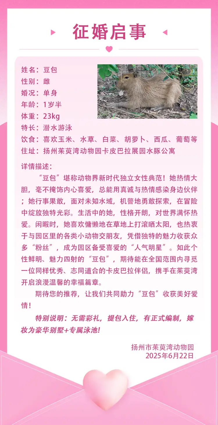 扬州出逃卡皮巴拉“豆包”公开征婚:无须彩礼且有正式编制。