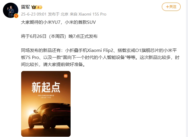雷军:小米YU7,小米的首款SUV将于6月26日晚7点正式发布。小米雷军发布微博称,大家期待的小米YU7,小米的首款SUV 将于6月26日(本周四)晚7点正式发布。同场发布的新品还有:小折叠手机Xiaomi Flip2、搭载玄戒O1旗舰芯片的小米平板7S Pro、以及一款“面向下一个时代的个人智能设备”等等。