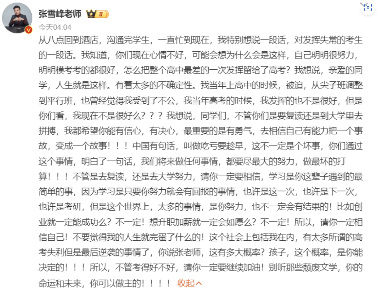 “我知道,你们现在心情不好,可能会想为什么会是这样,自己明明很努力,明明模考考的都很好,怎么把整个高中最差的一次发挥留给了高考?我想说,亲爱的同学,人生就是这样。有着太多的不确定性。同学们,不管你们是要复读还是到大学里去拼搏,我都希望你能有信心,有决心,最重要的是有勇气,去相信自己有能力把一个事故,变成一个故事。不管是去复读,还是去大学努力,请你一定要相信,学习是你这辈子遇到的最简单的事,因为学习是只要你努力就会有回报的事情,也许是这一次,也许是下一次,也许是考研,但是这个世界上,太多的事情,是你努力,也不一定会有结果的!这个社会上包括我在内,有太多所谓的高考失利但是最后逆袭的事情了,你说张老师,这有多大概率?孩子,这个概率,是你能决定的!!!所以,不管考得好不好,请你一定要继续加油!别听那些颓废文学,你的命运和未来,你可以做主的。”