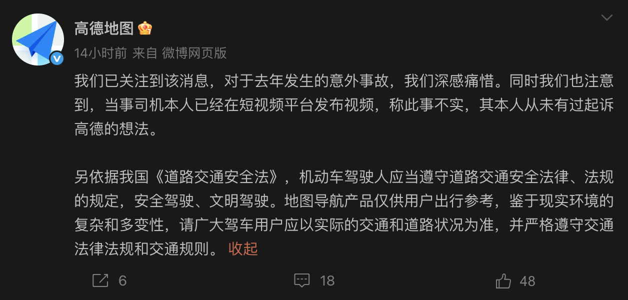 高德地图回应男孩骑行身亡案相关报道:当事司机从未有过起诉高德的想法。7月1日,有媒体报道称,此前备受关注的“河北男孩骑行身亡案”有了新进展,继4月收到不起诉决定后,当事司机姜永亮将起诉高德地图。相关报道引发热议后,姜永亮通过抖音账号发布澄清视频,否认起诉高德,称事件已经过去,只想回归正常生活。7月1日晚间,高德地图发文称,已关注到该消息,对于去年发生的意外事故,公司深感痛惜。同时也注意到,当事司机本人已经在短视频平台发布视频,称此事不实,其本人从未有过起诉高德的想法。