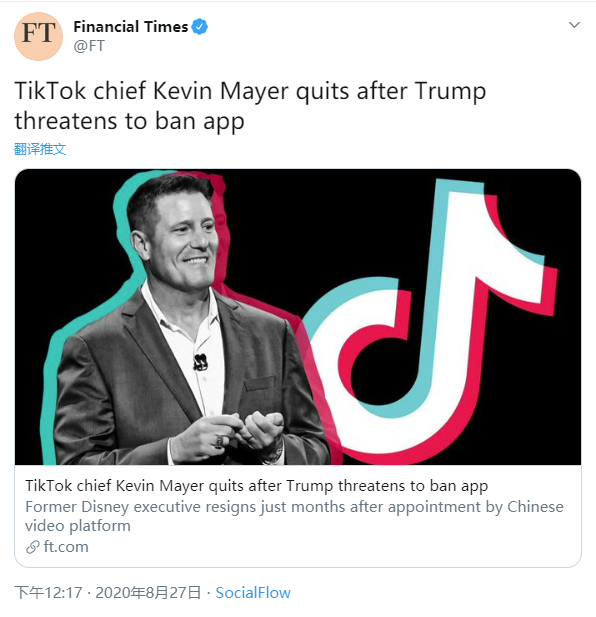 据英国金融时报报道,一封致员工的信显示,Kevin Mayer已辞去TikTok首席执行官一职。Mayer在信中表示,“最近几周,随着政治环境急剧变化,我认真思考了公司结构变化的要求,以及这对我当初应聘的这个全球角色意味着什么。在这种情况下,我们预计很快就会有解决办法,我怀着沉重的心情告诉大家,我已经决定离开公司。”信中称,TikTok现任总经理Vanessa Pappas将担任临时主管。