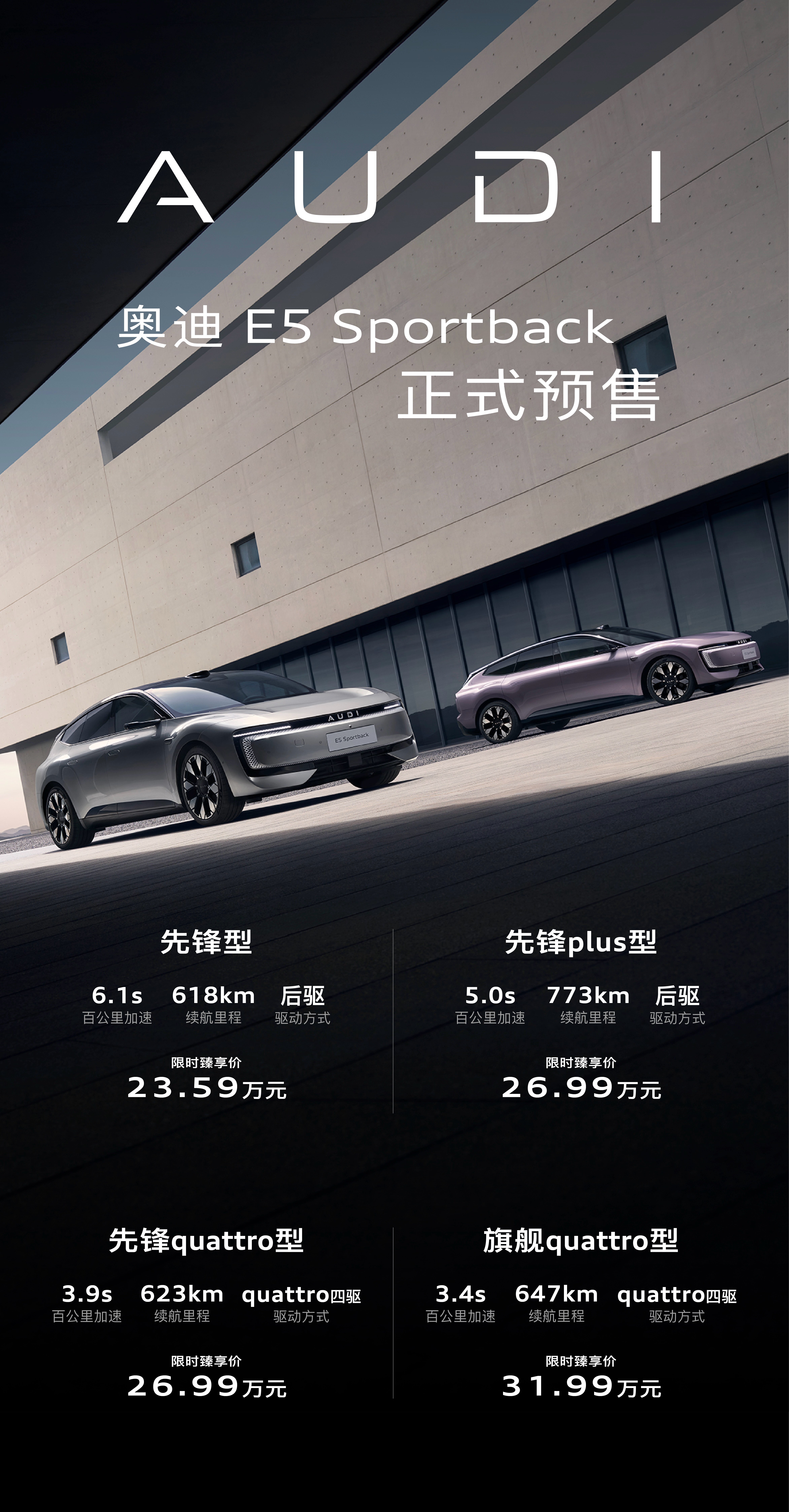 奥迪E5 Sportback预售价23.59万元起。