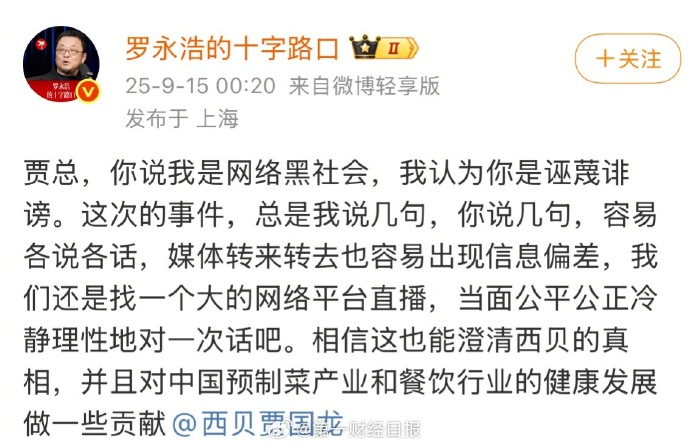 罗永浩深夜发文,邀西贝贾国龙直播对话。据界面新闻,近日,西贝餐饮与罗永浩就预制菜引发的争论在网络上持续发酵。14日晚间,西贝创始人贾国龙此前表态的完整截图流出,其中除了提到西贝从今以后要打明牌、向胖东来学习外,还将罗永浩称为网络黑嘴、网络黑社会。对此,罗永浩今日凌晨在社交平台表示,本次事件中双方总是各说各话,媒体转来转去也容易出现信息偏差。他提议,双方找一个大型网络平台直播,当面对话。