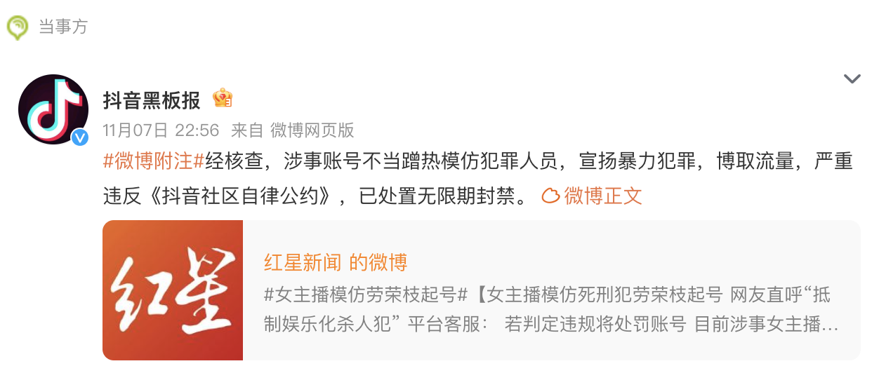 抖音通报女主播模仿劳荣枝。11月7日,一河北ip的名叫“劳枝数到三”的主播,模仿2023年被执行死刑的罪犯劳荣枝,引起部分网友反感。她在直播中多次模仿劳荣枝在法庭上的辩解发言。对此,@抖音黑板报 7日晚回应称,经核查,涉事账号不当蹭热模仿犯罪人员,宣扬暴力犯罪,博取流量,严重违反《抖音社区自律公约》,已处置无限期封禁。