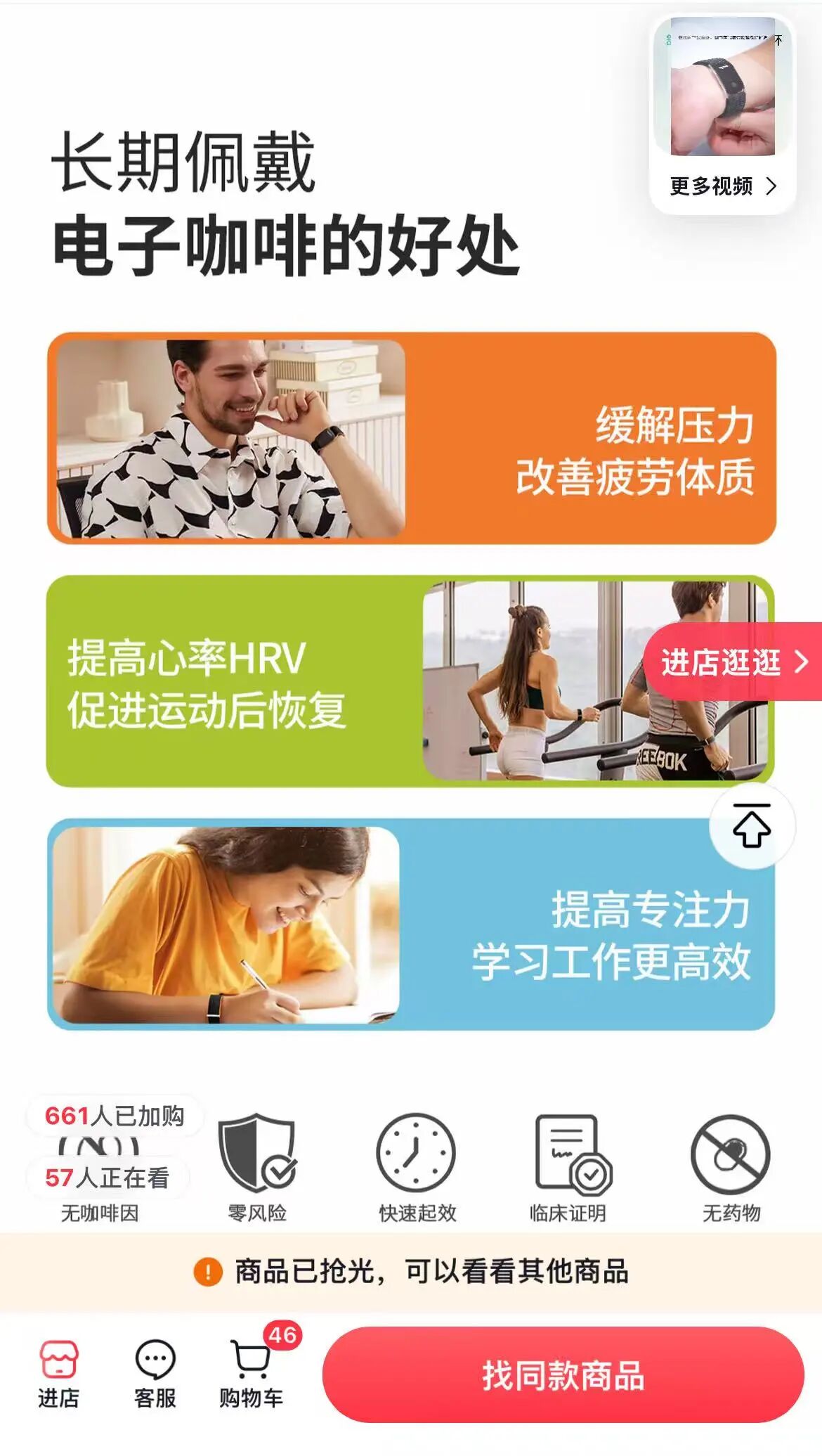 “累了困了就戴电子咖啡”,在“电子咖啡手环”的商品页上,这句slogan格外醒目,下方紧跟着一个“不含咖啡因”的标识。根据相关商品页介绍,长期佩戴电子咖啡的好处包括缓解压力改善疲劳体质,提高心率HRV促进运动后恢复,提升专注力学习工作更高效。