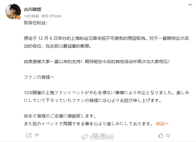 古川雄辉见面会取消。11月20日,日本演员古川雄辉发文表示,原定于12月6日举办的上海粉丝见面会因不可避免的原因取消。文中称:对于一直期待这次活动的各位,在此致以最诚挚的歉意。由衷感谢大家一直以来的支持,期待能在今后的其他活动中再次与大家相见。此前,受日本首相高市早苗发表错误言论,多部日本电影暂缓上映。