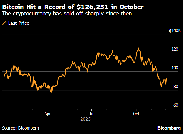 比特币周三延续了刚萌芽的反弹势头,触及两周高点,整个加密货币市场都在寻求从持续数周的下跌中持续回升。比特币一度上涨逾2.5%,逼近94,000美元,创11月17日以来的盘中高位。以太坊和其他主要代币也小幅上涨。近期跌得鼻青脸肿的数字资产市场仍未站稳脚跟。这轮下跌始于10月初,比特币刚创下逾12.6万美元的历史新高没几天的时候,加密货币市值自那以来缩水了超过1万亿美元。“我们并未在上方看到大量买家,”FalconX亚太区衍生品交易主管Sean McNulty表示。“市场情绪依然脆弱。”