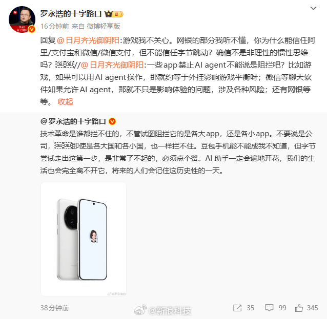 罗永浩回应网友谈AI助手风险。今日曾发文谈及豆包手机,并称试图阻拦AI助手技术革命的App是拦不住的。有网友对此表示质疑,称一些app禁止AI agent不能说是阻拦吧,比如游戏如果可以用AI agent操作,那就约等于外挂影响游戏平衡呀,微信等聊天软件如果允许AI agent,那就不只是影响体验的问题,涉及各种风险,还有网银等等。对此,罗永浩亲自回应表示游戏我不关心,网银的部分我听不懂,你为什么能信任阿里支付宝和微信微信支付,但不能信任字节跳动,确信不是非理性的惯性思维吗