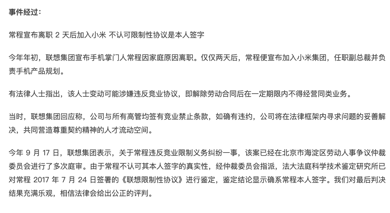 联想再回应 “常程跳槽小米”:已付股权对价500余万,须偿还。