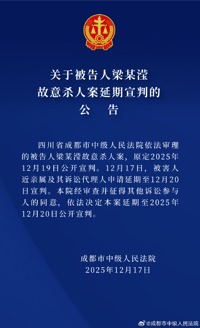 成都女子家门口遇害案延期宣判。成都市中级人民法院12月17日公告,四川省成都市中级人民法院依法审理的被告人梁某滢故意杀人案,原定2025年12月19日公开宣判。12月17日,被害人近亲属及其诉讼代理人申请延期至12月20日宣判。本院经审查并征得其他诉讼参与人的同意,依法决定本案延期至2025年12月20日公开宣判。
