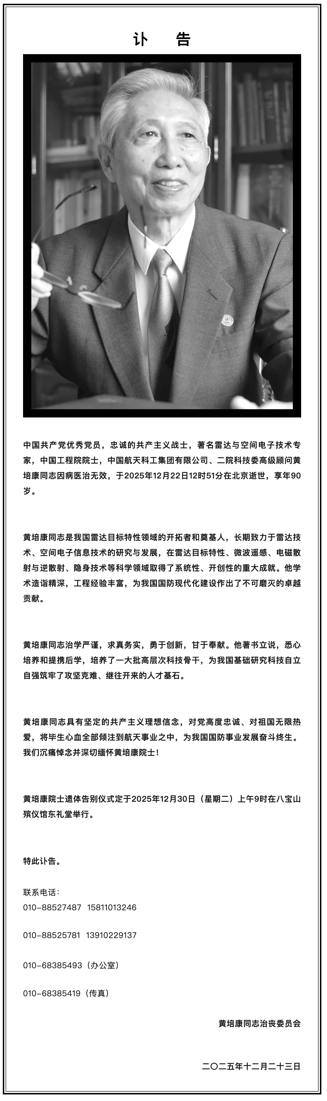 据中国航天科工官微消息,中国共产党优秀党员,忠诚的共产主义战士,著名雷达与空间电子技术专家,中国工程院院士,中国航天科工集团有限公司、二院科技委高级顾问黄培康同志因病医治无效,于2025年12月22日12时51分在北京逝世,享年90岁。黄培康是我国雷达目标特性领域的开拓者和奠基人,长期致力于雷达技术、空间电子信息技术的研究与发展,在雷达目标特性、微波遥感、电磁散射与逆散射、隐身技术等科学领域取得了系统性、开创性的重大成就。他学术造诣精深,工程经验丰富,为我国国防现代化建设作出了不可磨灭的卓越贡献。