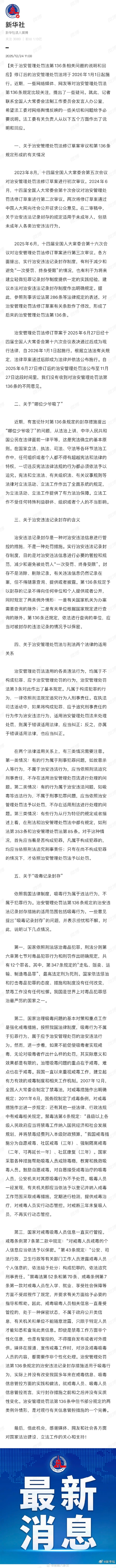 据财联社12月24日电,修订后的治安管理处罚法将于2026年1月1日起施行。近期,一些网络媒体、网友等对治安管理处罚法第136条规定比较关注,提出了一些疑问。就此,法工委有关负责人从五个方面作出了说明和回应。