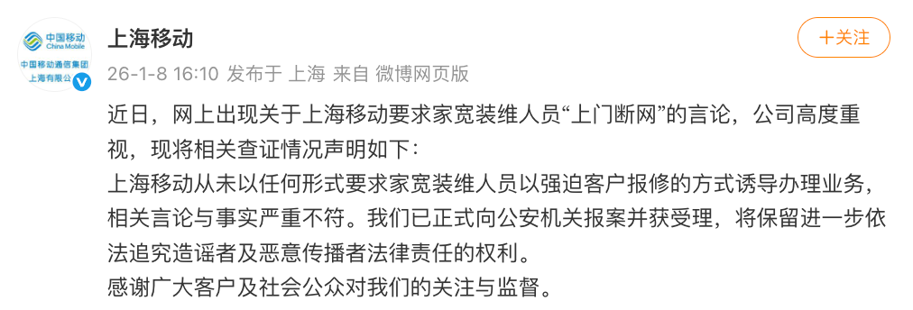 1月8日16时许,“上海移动”官方微博回应称,近日,网上出现关于上海移动要求家宽装维人员“上门断网”的言论,公司高度重视,现将相关查证情况声明如下: