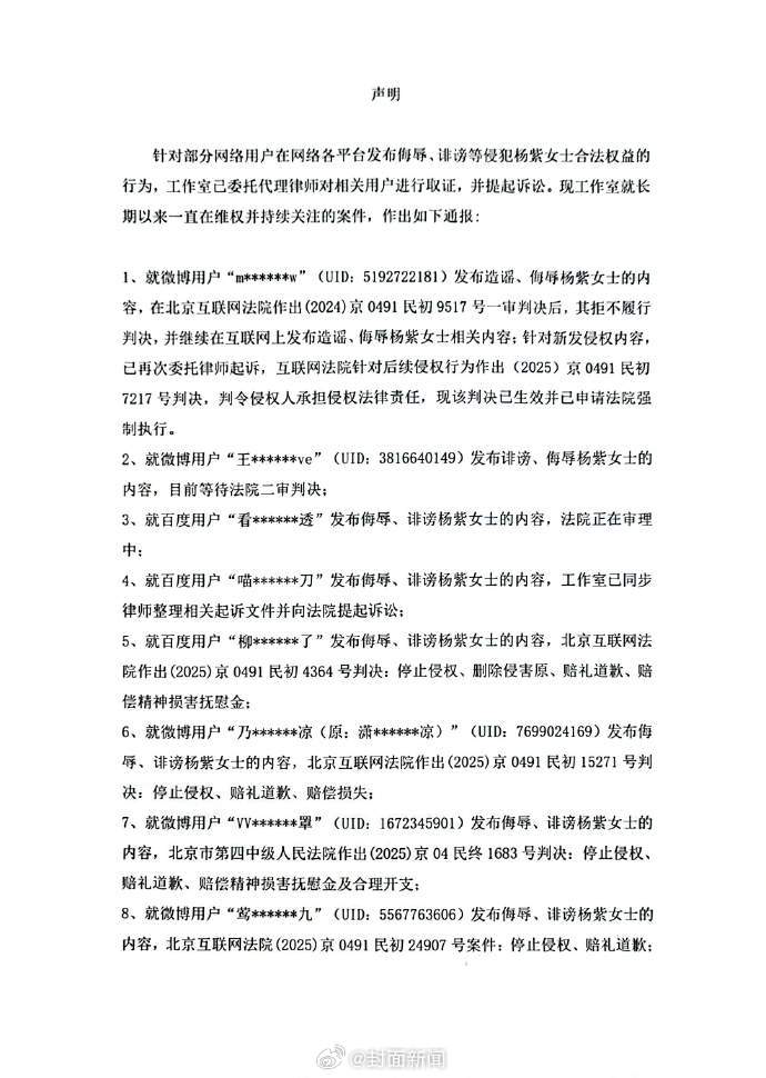 杨紫工作室于1月29日发布维权进展声明。声明指出部分网络用户在各平台发布侮辱诽谤内容侵犯艺人合法权益。工作室表示长期持续关注侵权行为并采取维权措施。委托律师将依法追究侵权主体的法律责任。工作室强调对所有侵权行为采取零容忍态度。法律手段包括但不限于民事诉讼与刑事报案。该声明旨在警示潜在侵权者并维护艺人名誉权。