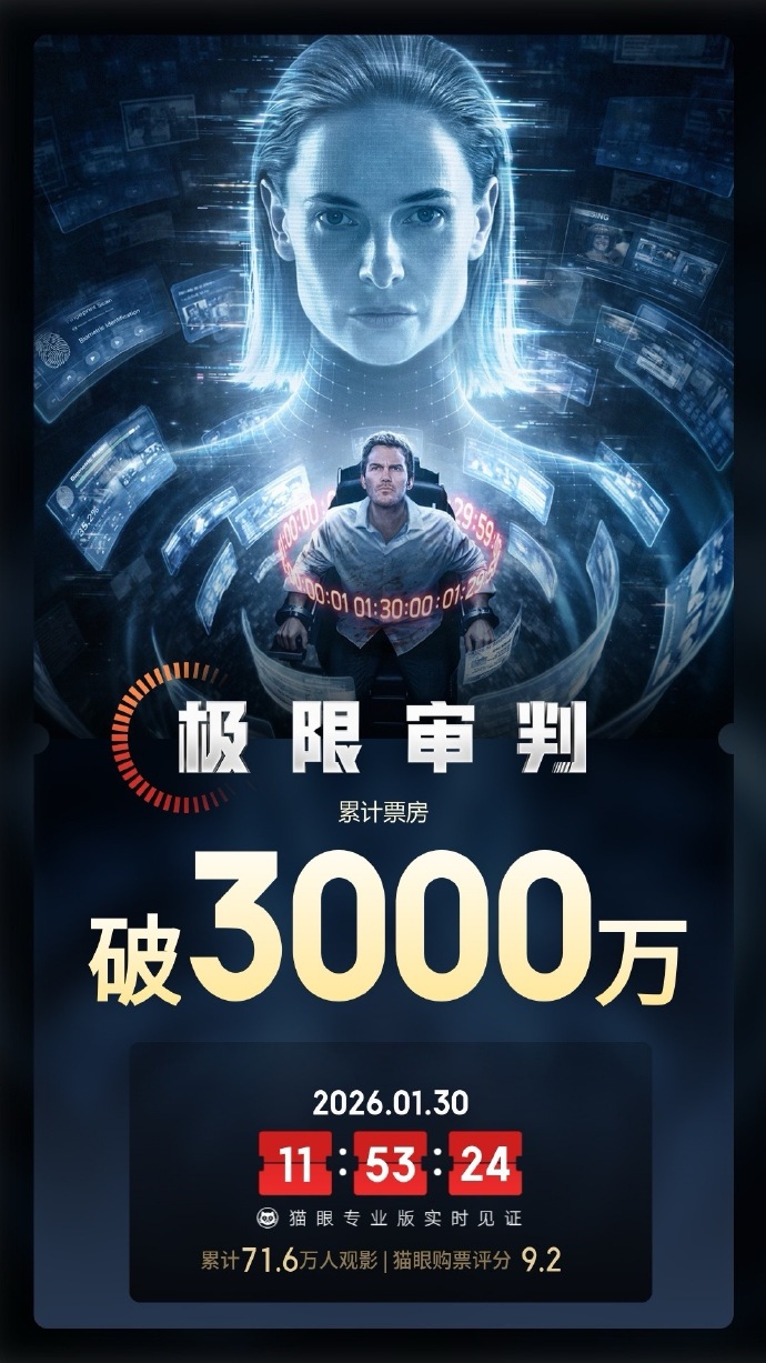 1月30日,据猫眼专业版数据,电影《极限审判》上映8天,中国内地总票房破3000万​​​元。