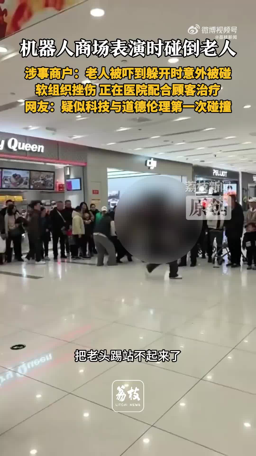 成都凯德广场(魅力城店)发生人形机器人表演意外事故。商户组织的人形机器人在表演过程中与围观老人发生碰撞。现场画面显示机器人与老人双双倒地。涉事商户工作人员表示老人因受惊吓试图躲避时与机器人相碰。老人被诊断为软组织挫伤并送医治疗。商户称正在医院积极配合治疗并处理善后事宜。事件引发公众对商场机器人表演安全性的关注。