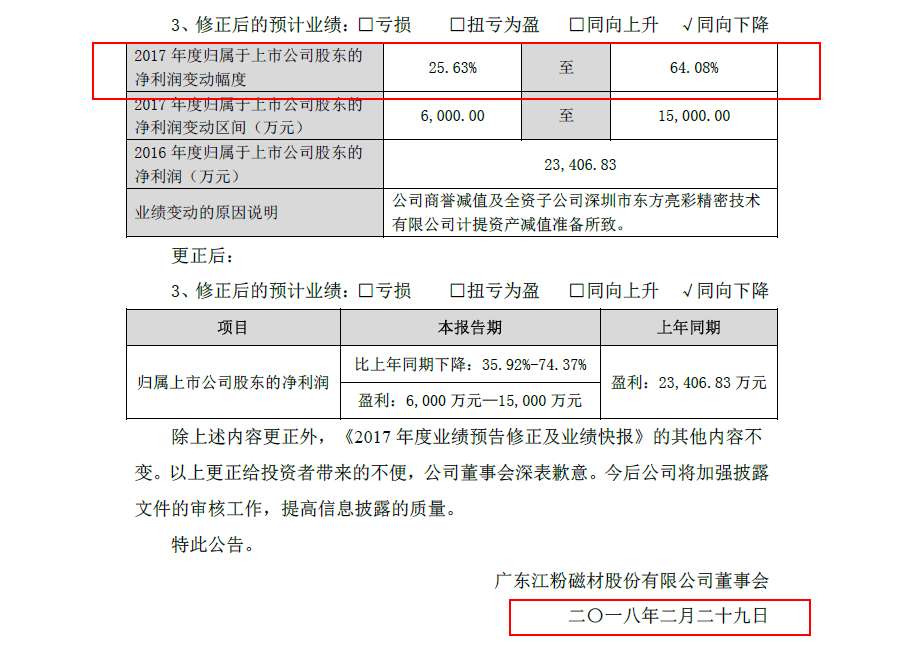 上市公司花式造新闻,公告落款日期公然写着2018年2月29日?正海磁材(SZ:002600)2月28日发了一则2017年业绩预告和快报,利润下滑25.63%。结果发现算错了,应该是64.08%,更正一下,结果妥妥的错过一波稀土行情,这本就是个悲伤的故事。谁料在更正公告当中,落款日期竟然是二〇一八年二月二十九日,投资者不仅看的公告是假的,就连更正公告也是假的,情何以堪!