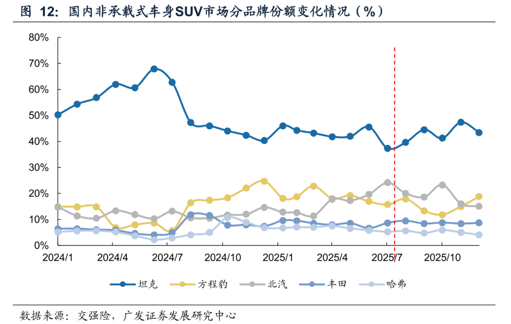 作为中国越野市场的绝对龙头,坦克品牌2025年累计销量达232,713辆,在非承载车身SUV市场中份额达43%。但在30万以上高端越野市场,竞争格局仍未定型,坦克品牌以48.5%的份额占据优势——这为坦克700向上突破留出了足够的空间。