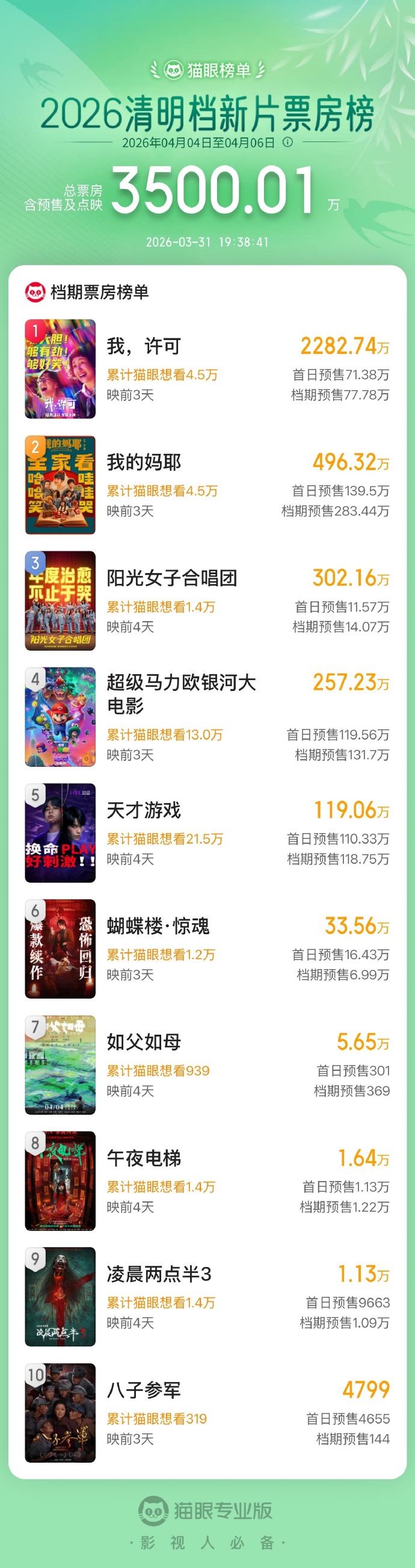 2026年清明档新片预售票房数据显示总金额已突破3500万元。该数据统计截止时间为3月31日19时38分。当前预售票房前三名的影片分别是《我,许可》《我的妈耶》和《阳光女子合唱团》。票房数据来源于猫眼专业版的统计报告。