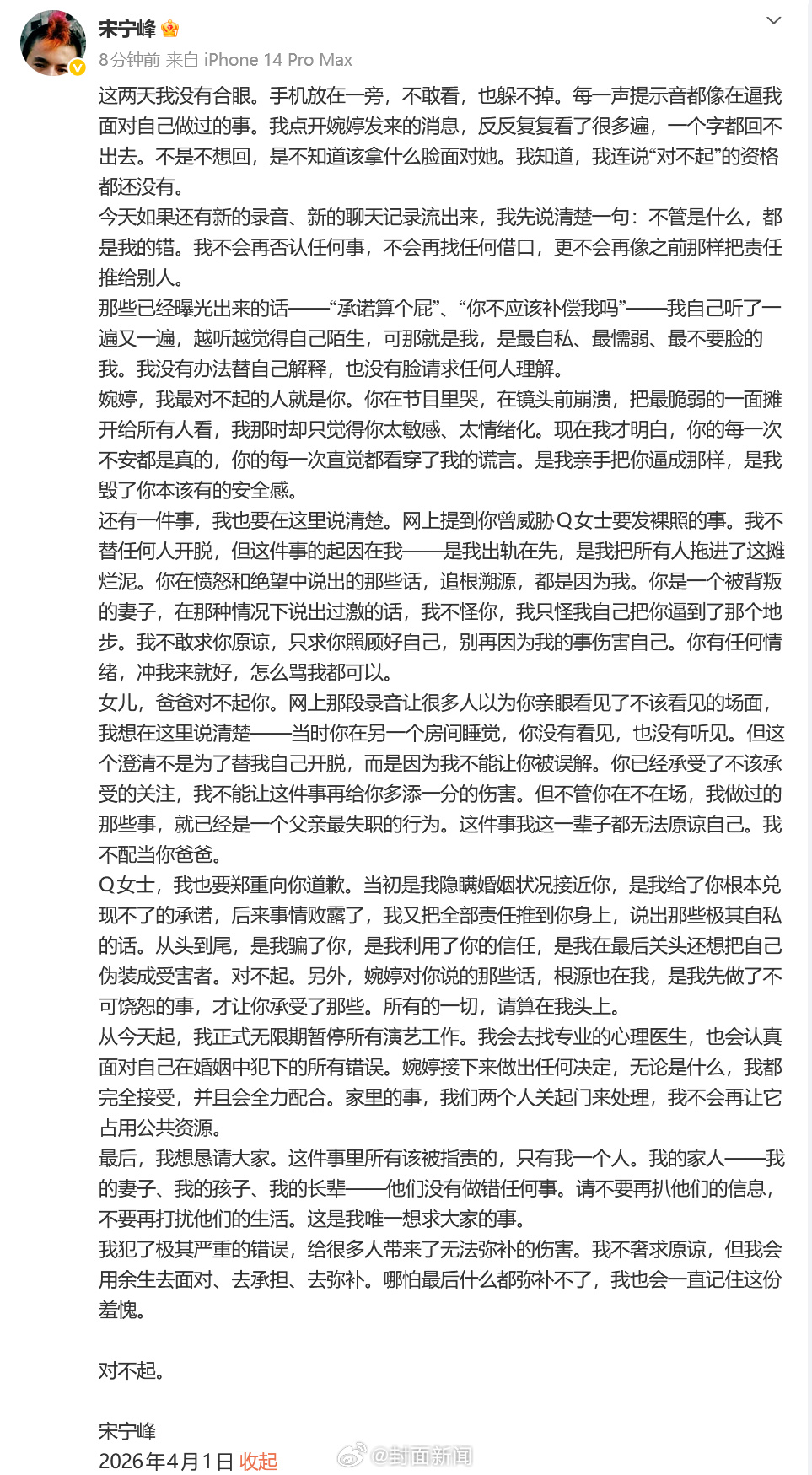 4月1日,演员发长文回应出轨,向张婉婷、女儿以及Q女士道歉,并宣布无限期暂停所有演艺工作。他在文中写道:“我犯了极其严重的错误,给很多人带来了无法弥补的伤害。我不奢求原谅,但我会用余生去面对、去承担、去弥补。哪怕最后什么都弥补不了,我也会一直记住这份羞愧。”