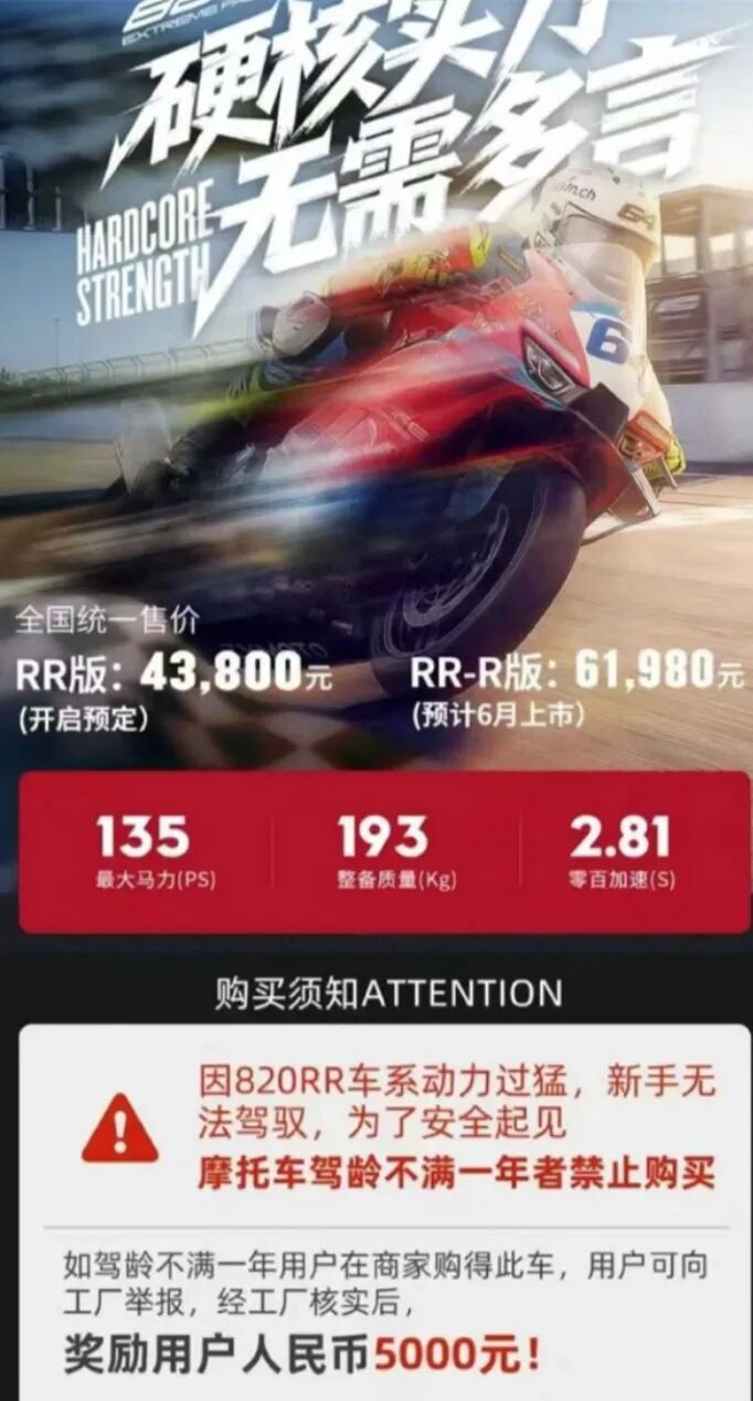 3月21日,张雪机车仿赛车型820RR对外预定,该车型最大马力135匹,整备质量193公斤,零百加速2.81秒,价格为43800元至61980元。预定海报上显示,因820RR车系动力过猛,新手无法驾驭,为了安全起见,摩托车驾龄不满一年者禁止购买该车。如驾龄不满一年用户在商家购得此车,用户可向工厂举报,经工厂核实后,奖励用户5000元。