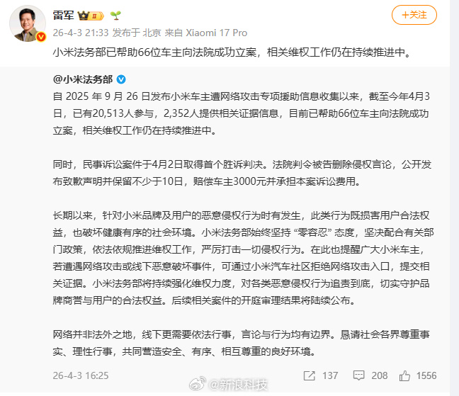 回应小米法务部帮助车主维权表示小米法务部已帮助66位车主向法院成功立案,相关维权工作仍在持续推进中