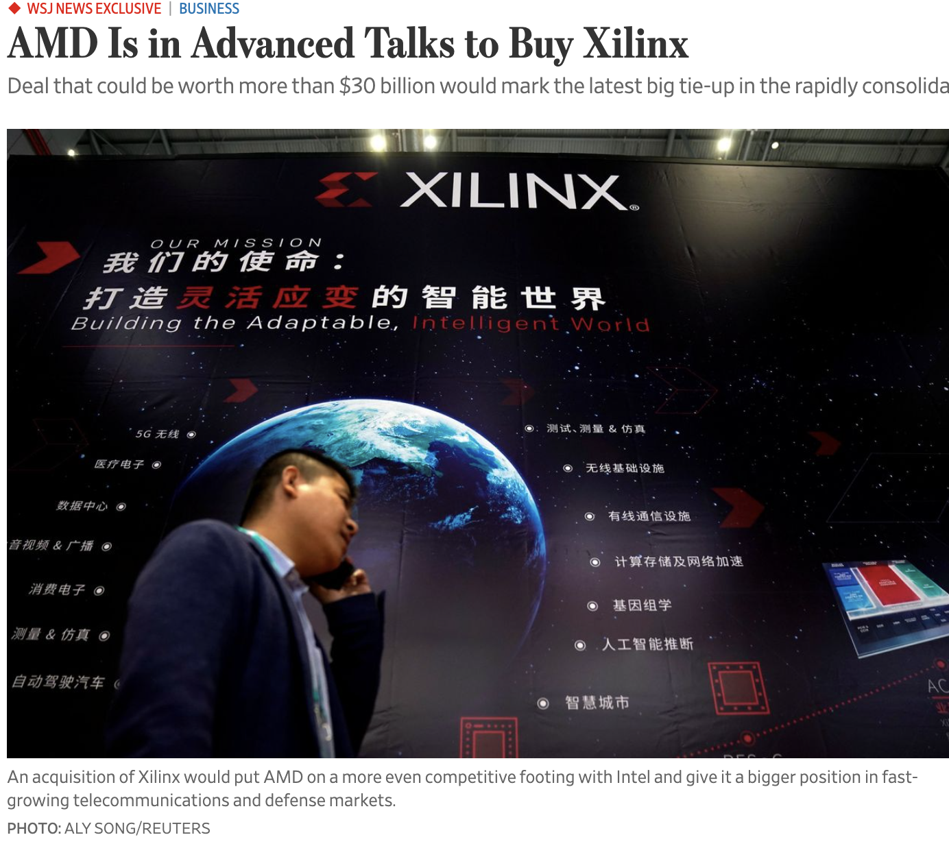 10月9日,据华尔街日报报道,AMD正就收购半导体制造商赛灵思(Xilinx)展开深入谈判,最快可能在下周完成谈判。该报道引述知情人士称,这笔交易的价值可能超过300亿美元,该交易标志着半导体行业的最新一次迅速整合以及重大合作。