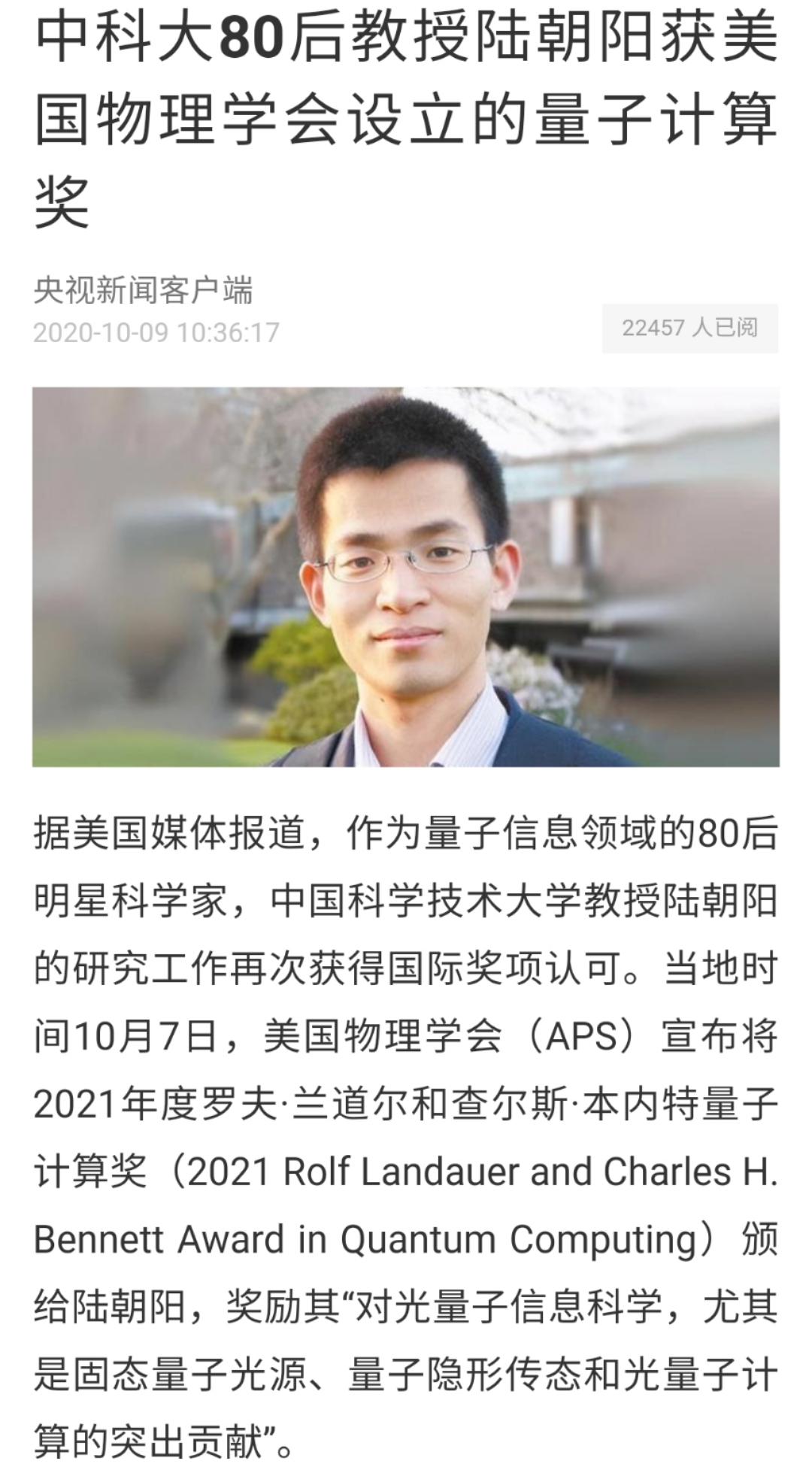 10月9日,据美国媒体报道,作为量子信息领域的80后明星科学家,中国科学技术大学教授陆朝阳的研究工作再次获得国际奖项认可。当地时间10月7日,美国物理学会(APS)宣布将2021年度罗夫·兰道尔和查尔斯·本内特量子计算奖(2021 Rolf Landauer and Charles H. Bennett Award in Quantum Computing)颁给陆朝阳,奖励其“对光量子信息科学,尤其是固态量子光源、量子隐形传态和光量子计算的突出贡献”。