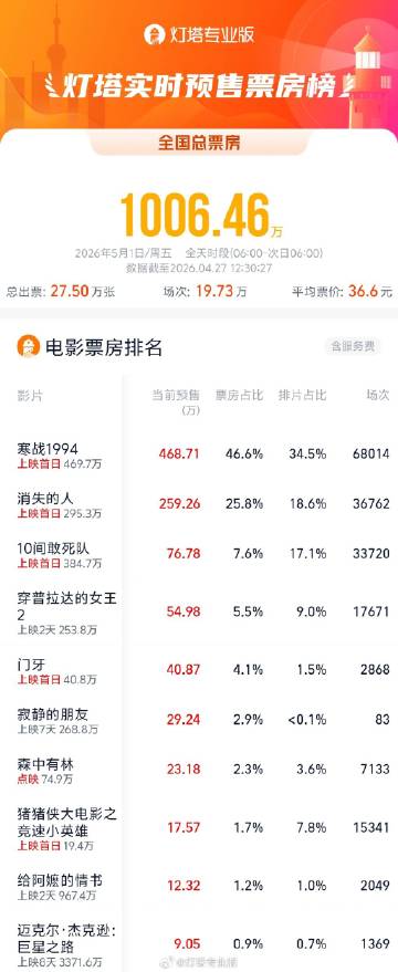 2026年五一档首日预售票房数据显示突破1000万元。该数据由灯塔专业版统计,截至4月27日12时30分。预售票房前三名影片为《寒战1994》《消失的人》《10间敢死队》。这一数据反映了五一档期电影市场的初期热度。