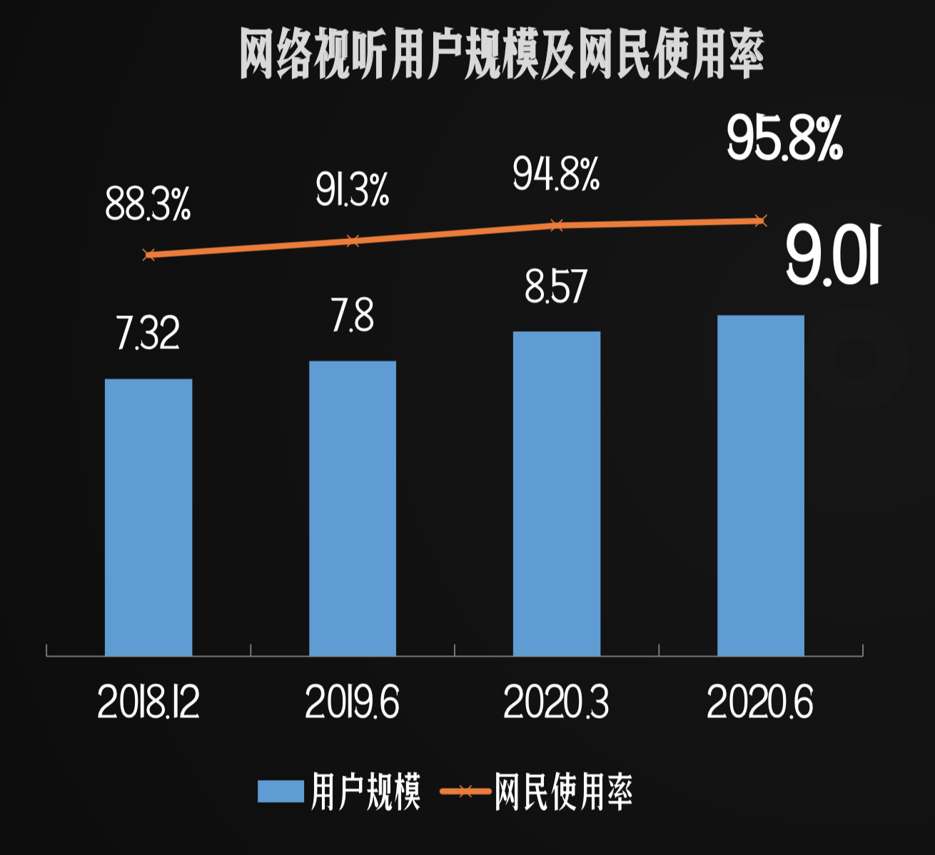 2019年网络视听产业市场规模为4541.3亿元。《2020中国网络视听发展研究报告》今日(2020.10.12)在成都发布,有几个数字值得关注:1、去年全年网络视听产业市场规模突破4500亿元。2、网络视听用户规模突破9亿,网民使用率95.8%。3、综合视频用户规模达7.24亿。4、在用户规模中,90后、高学历、一线城市用户占比相对较高。