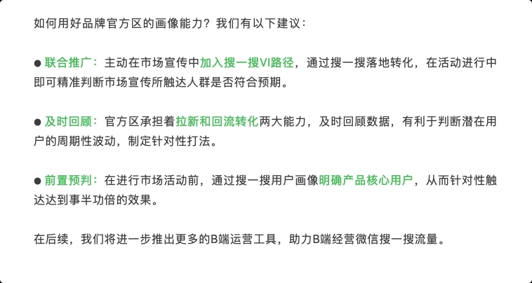 你的品牌谁在搜?微信搜一搜用户画像能力开放。10月21日消息,微信搜一搜品牌官方区首次开放“用户画像“能力,提供人口属性、地域分布和设备分布三大核心数据,帮助品牌主精准锁定潜在用户。查看方式:登陆mp端->微信搜一搜->品牌官方区->数据概览。后续将进一步在搜一搜商户助手小程序开放。