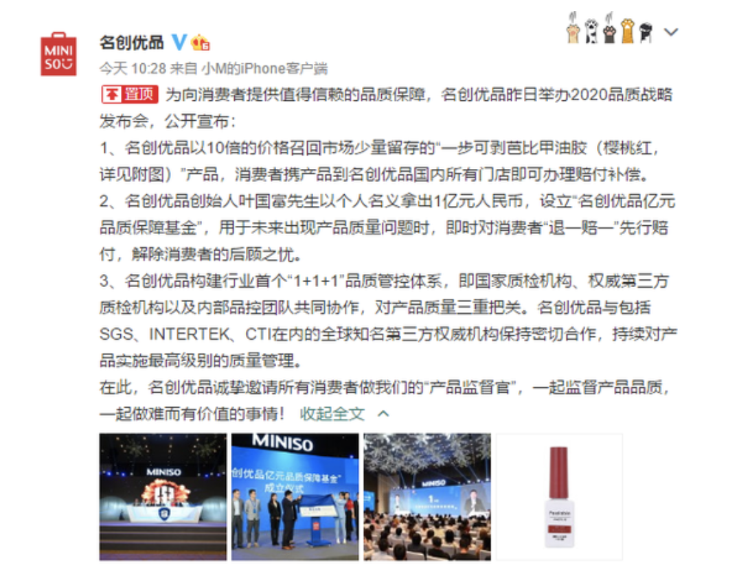 名创优品回应指甲油抽检不合格:将以10倍价格召回。
