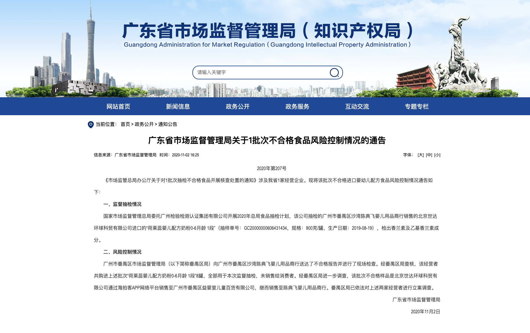 康维多一批次婴儿配方奶粉检出禁用香精,经营者已被立案调查。据广东省市场监督管理局11月2日发布的《关于1批次不合格食品风险控制情况的通告》显示,一批次“荷莱蕊婴儿配方奶粉0-6月龄 1段”,检出香兰素及乙基香兰素成分。经番禺区局查核,该批次不合格奶粉未销售给消费者。经番禺区局进一步调查,该批次不合格样品是北京世达环球科贸有限公司通过海拍客APP网络平台销售至广州市番禺区益婴室儿童百货有限公司,继而销售至陈典飞婴儿用品商行。番禺区局已依法对上述两家经营者进行立案调查。