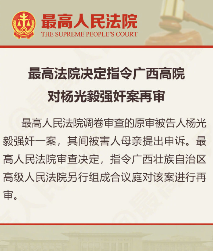 最高法指令对杨光毅强奸案再审,此前二审改判为死缓。