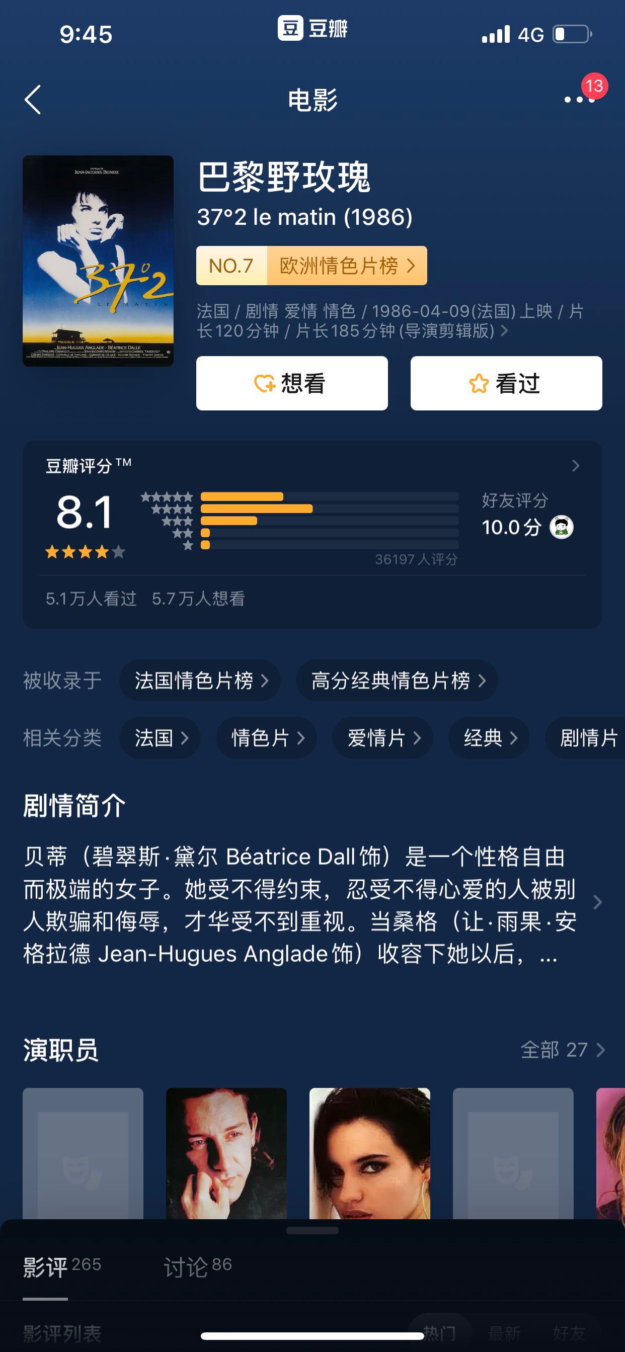 不过此刻突然跳入我脑子里的是十多年前一度疯狂喜欢的《37°2》(又《巴黎野玫瑰》)。