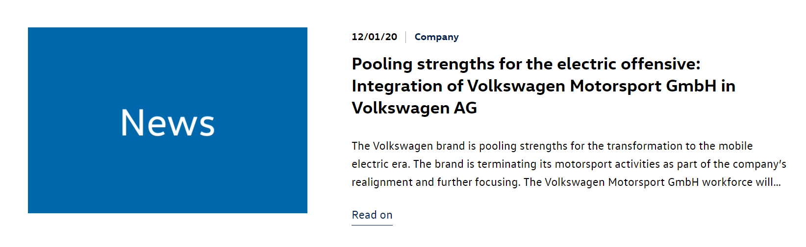 大众官方宣布解散赛车运动部门,169名员工将被整合进大众民用车公司,此举是为了全力投入到电动车研发中。大众运动部门曾参加达喀尔拉力赛、WRC世界拉力锦标赛、TCR世界房车赛等多项著名赛事,研发了ID.R纯电动赛车打破多项赛道纪录。