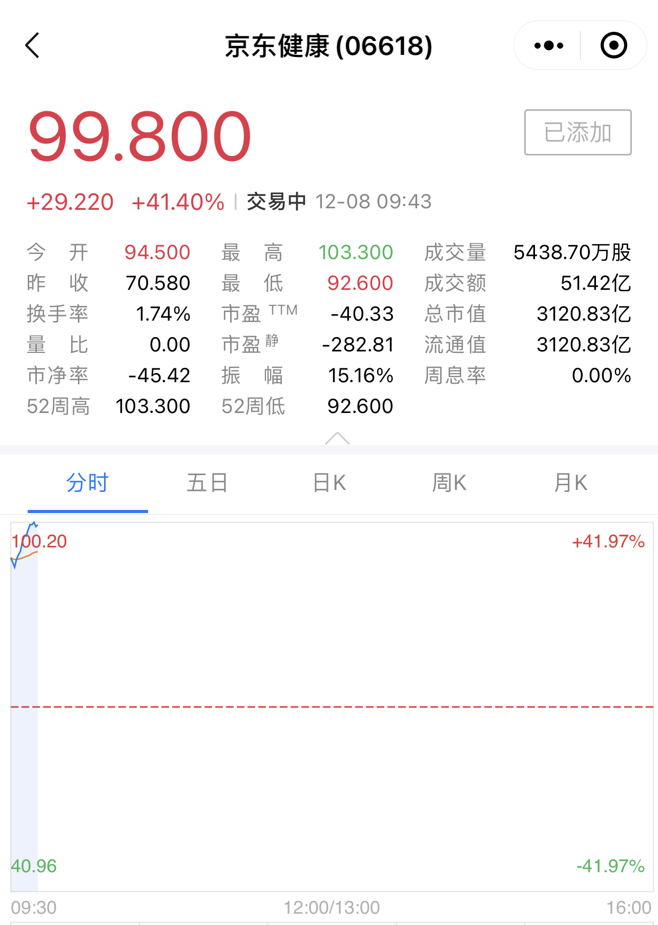 京东健康今日正式登陆港交所,开盘价94.50港元,较发行价上涨约34%。截至目前,其股价已涨至99.80港元,总市值3120. 83亿港元,超过阿里健康(3087.71亿)。