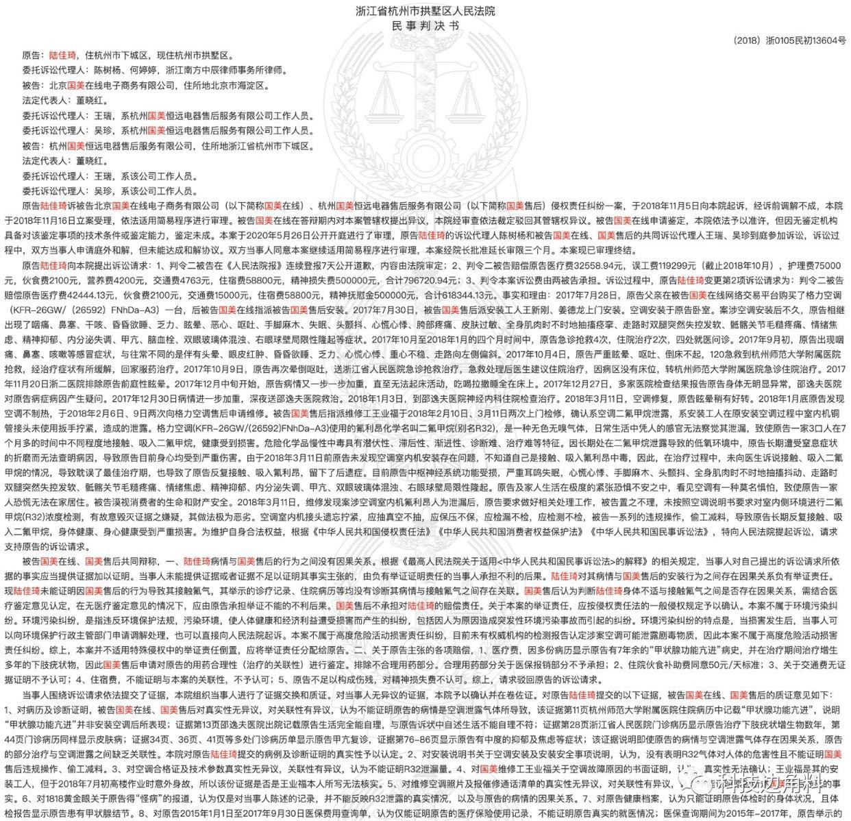 杭州市拱墅区人民法院审理认定国美售后工作人员安装该空调器未拧紧接头螺母,导致二氟甲烷泄露的事实,必然造成室内环境污染。国美在线、国美售后未能举证证明涉案空调器二氟甲烷泄露导致室内空气污染与陆某某健康受损不存在因果关系,也未能举证证明存在法律规定的不承担责任或减轻责任的情形,应当承担侵权责任。6月30日一审判处北京国美在线电子商务有限公司赔偿陆某某各项损失共109344.13元。
