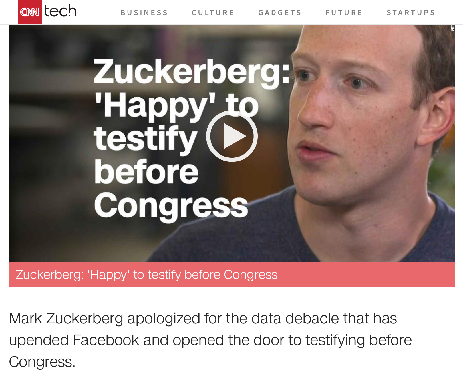 沉默了许久后,小扎在Facebook个人主页上发表了一段超长的声明,随后还接受了CNN的采访。他为这次的事情道歉,并表示Facebook错信了剑桥分析公司,他愿意前往国会就相关情况进行作证。他的原话是这样的:“我们会派出公司里最懂行的人,如果那个人是我,我很乐意去国会作证。”然鹅,严格的CNN把Happy这个词打了引号。看小扎这一副马上要哭出来的样子,不忍骂。