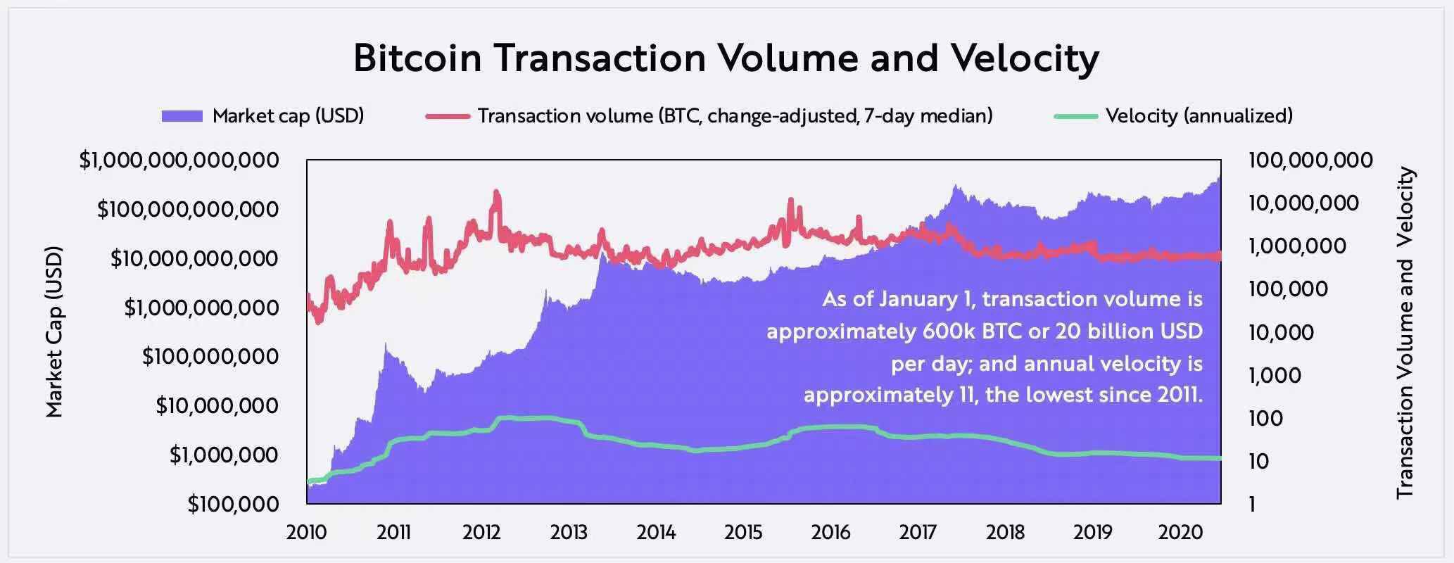 关于比特币的两个大数据:1,比特币自创建以来,已经结算了大约10万亿美元的交易,突显了其作为全球结算系统的能力。2,交易数量是经济活动的良好代表,但在短期内与价格没有高度关联。比特币在其12年的历史中已促成超过6亿笔交易,尽管价格大幅波动,近几年来仍在继续活跃。例如,在2018年的熊市期间,由于比特币的价格下跌了73%,交易数量实际上增加了约35%,如下所示,这表明网络活动活跃。